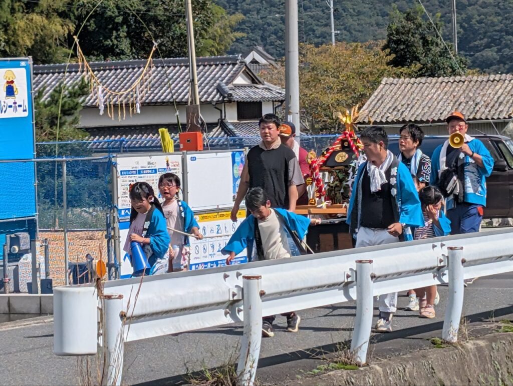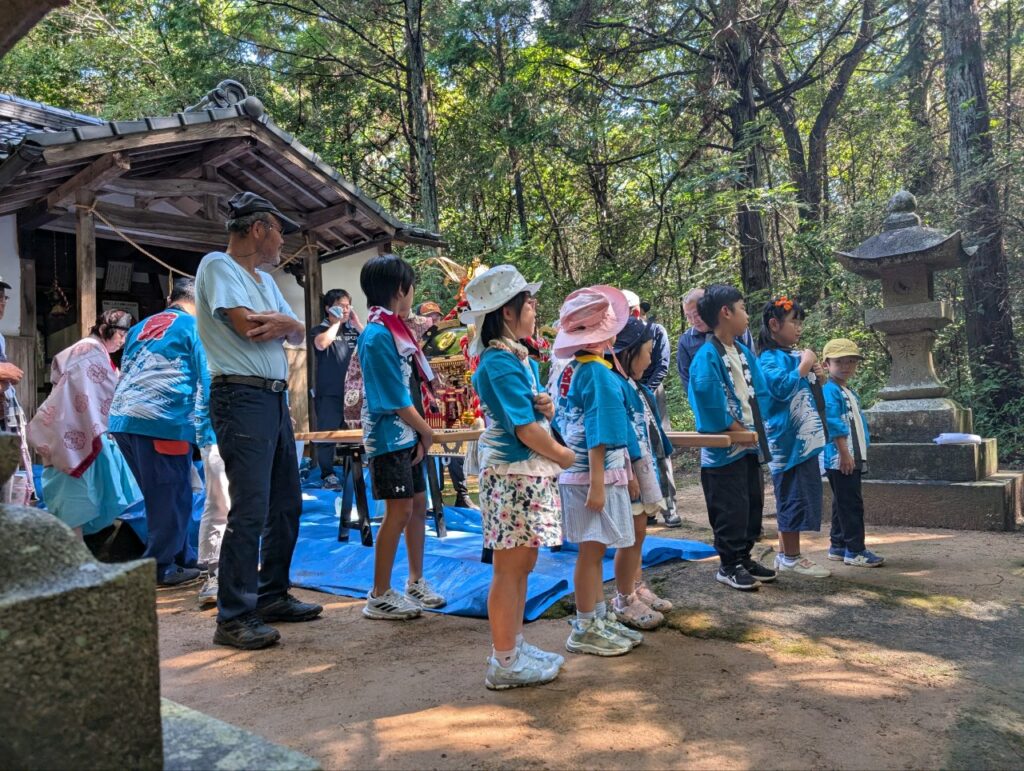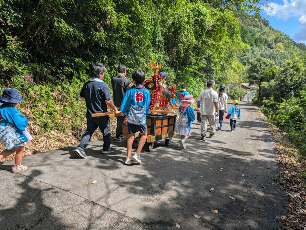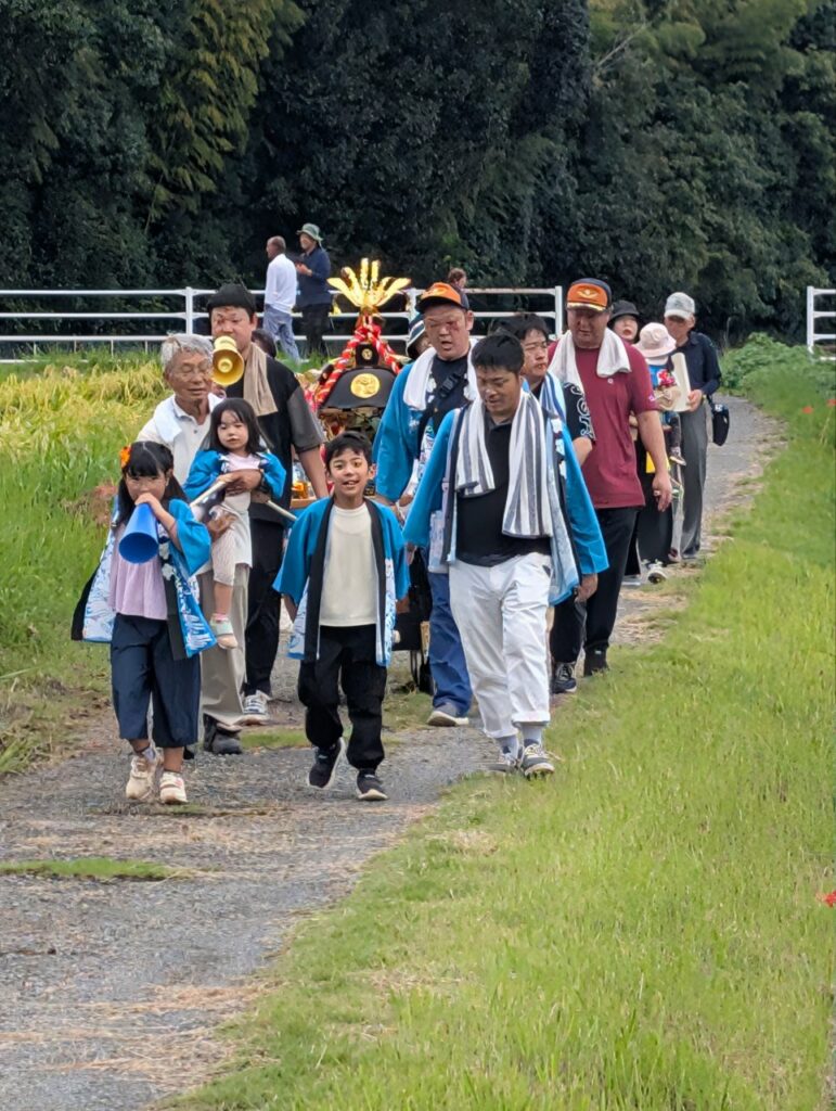 10月5日、熊野神社で母谷区自治会と母谷消防団の協力で秋祭りが行われました。10時から宮司による祝詞奉上、玉ぐし奉納等が子供神輿に参加する親子を含めて行われ、終了後に子供神輿が鐘や太鼓に合わせて地区を回りました。宮総代の方や消防団のみなさんお疲れ様でした。たくさんの子ども達が参加くださり、ありがとうございました。これから稲刈りが本格化しますが、晴れの日が続き豊作になりますように!