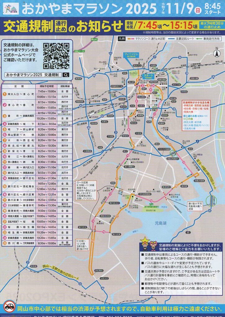 「おかやまマラソン交通規制のお知らせ」20251109 投稿日:2025年11月5日 今年も11月9日に「おかやまマラソン」が開催されますが、7時45分頃から15時15分頃までランナーの走る時間に合せて交通規制(通行止め)が実施されます。車での走行はご注意願います。また、応援の方もご協力を宜しくよろしくお願いいたします。 詳細は以下で おかやまマラソン交通規制 ツイート カテゴリー:地域ニュース