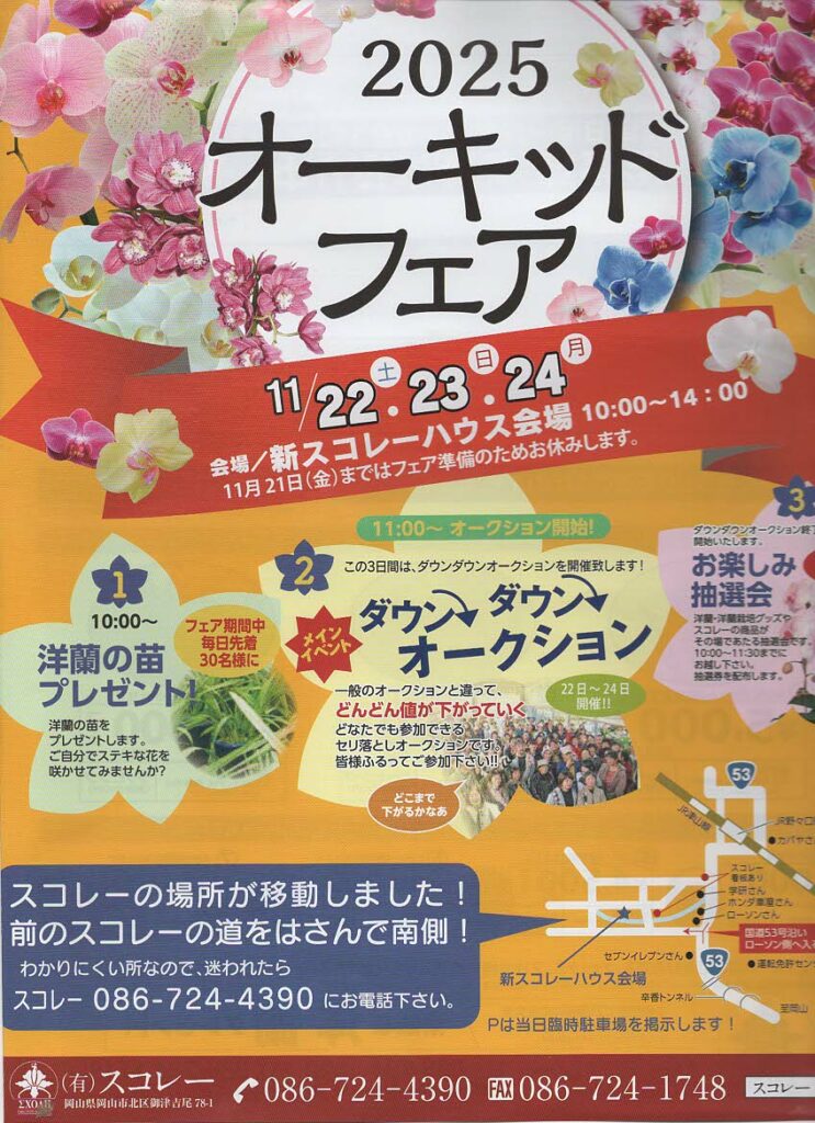オーキッドフェアのチラシを入手しましたので紹介します。11月22日(土)~24日(月祝)まで御津吉尾のスコレーで開催されます。素晴らしい蘭やシクラメンが販売されていますので、ご来場をお願いいたします。ダウンダウンオークションをお楽しみ下さい。