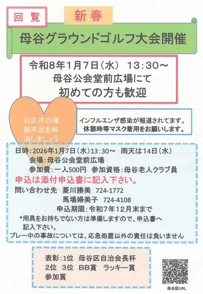 新春グラウンド・ゴルフ大会の開催案内( 回覧) 投稿日:2025年12月14日 母谷老人クラブ主催による、グラウンド・ゴルフ大会の案内です。 **令和8年1月7日(水) 13時30分より公会堂前広場にて開催**初めての方、歓迎いたします。(用具は事前に連絡頂ければ準備致します。) 詳しくは、下記「回覧」をご覧ください。 新春グランドゴルフ2026 ツイート カテゴリー:老人クラブ