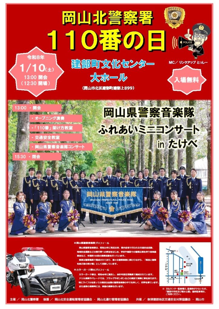 岡山北警察署LINE情報152 投稿日:2025年12月22日 岡山北警察署からLINEで届く情報を掲載しています(12/22) ★岡山北警察署110番の日 〜岡山県警察音楽隊 ふれあいミニコンサート〜 1/10(土)13時 建部町文化センター大ホールにて開会 詳細は以下で ツイート カテゴリー:電子町内会