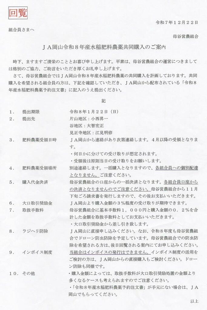 JA岡山令和8年産水稲肥料農薬共同購入のご案内(回覧) 投稿日:2025年12月30日 母谷営農組合 組合員の皆様へ 母谷営農組合からの案内です。母谷営農組合ではJA岡山令和8年産水稲肥料農薬の共同購入を計画しております。共同購入を希望される組合員の方は、JA岡山から配布される「令和8年産水稲肥料農薬予約注文書」に記入の上、提出願います。 詳細は以下の資料で 肥料農薬共同購入のご案内 ツイート カテゴリー:自治会