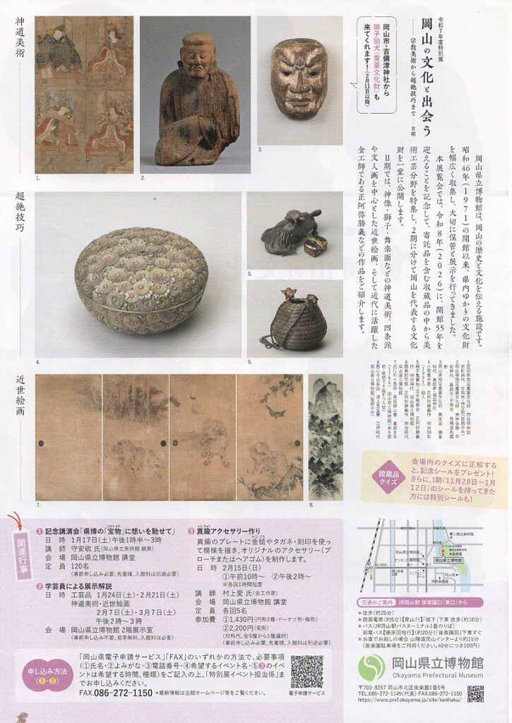 津高公民館で見つけたパンフの紹介です。「岡山の文化と出会うⅡ期」〜宗教美術から超絶技巧まで〜が1月17日(土)~3月8日(日)の間、岡山県立博物館で開館55年を迎えることを記念して開催されます。入場は65才以上230円です。岡山の歴史と文化を伝える作品を、是非お楽しみください。Ⅰ期も12日まで開催されていますので、まだご覧になられていない方はお見逃しなく!