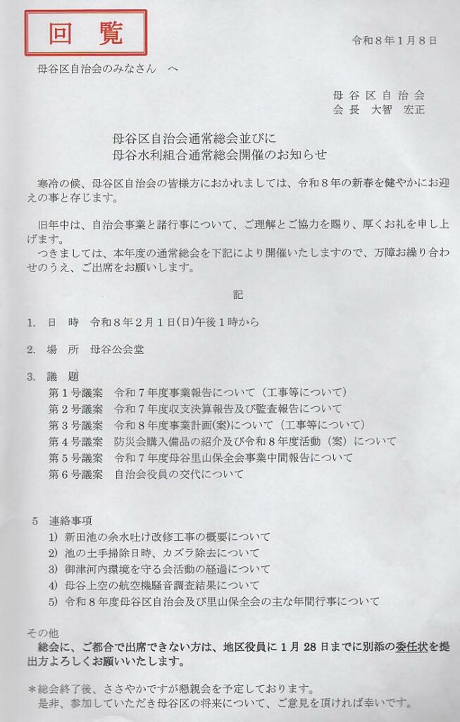 母谷区自治会及び水利組合通常総会の開催のお知らせ( 回覧)