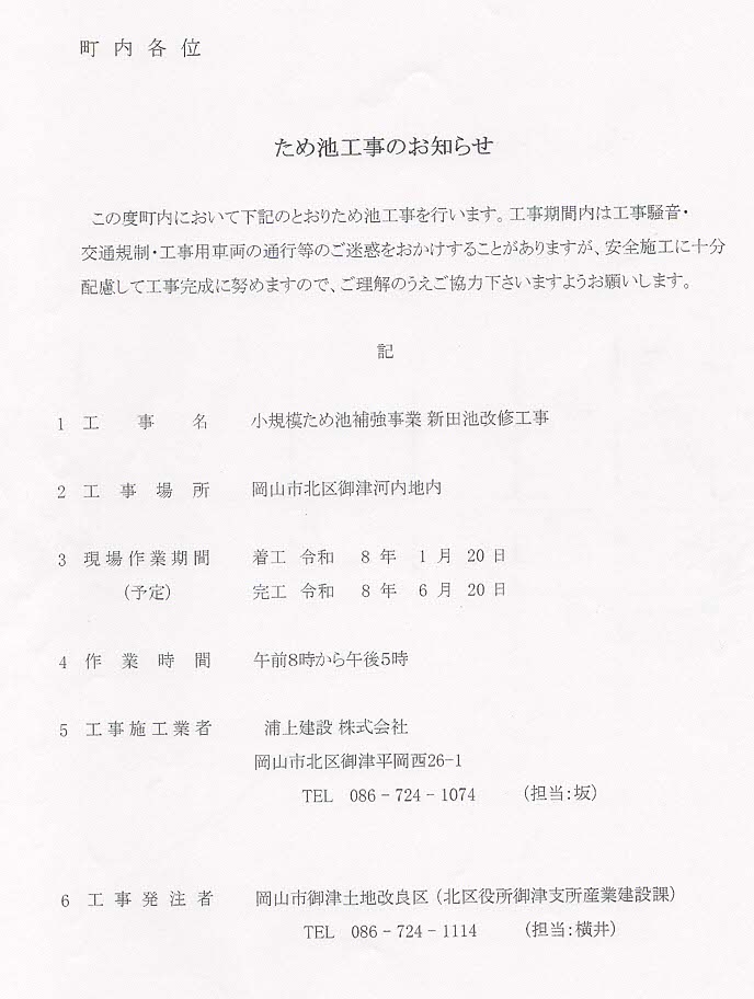 新田池改修工事のお知らせ(回覧) 投稿日:2026年1月26日 御津支所から新田池の改修工事のお知らせが届きましたので回覧いたします。 工事でご迷惑をお掛けしますが、ご協力をよろしくお願いいたします。 詳細は以下で 新田池改修工事のお知らせ(回覧) ツイート カテゴリー:自治会