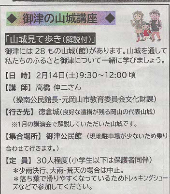 2、3月のおすすめ御津公民館講座その3は「御津の山城講座」です。2月14日9時半~12時頃に「山城見て歩き(徳倉城、解説付)」が操南公民館長(元岡山市教育委員会文化財課)の高橋伸二さんを講師に迎えて開催されます。たくさんの方々の参加をお待ちしています。