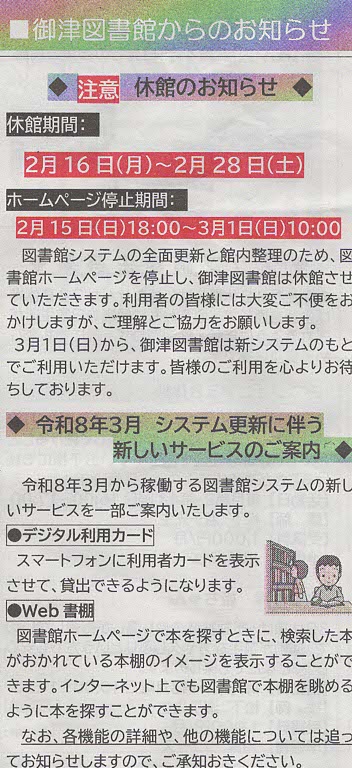 御津公民館だよりからのお知らせです。御津図書館が図書館システムの全面更新と館内整理のため、図書館ホームページを停止し、御津図書館は休館させていただきます。