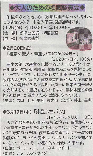 2、3月のおすすめ御津公民館講座その4は「大人のための名画鑑賞会」です。2月20日(金)10時~、14時~に上映されるのは加賀れんこんを題材にしたヒューマンドラマ「種蒔く旅人〜華蓮(ハス)のかがやき〜」、3月19日(木)10時~、14時に上映されるのは天才音楽家ショパンの物語「楽聖ショパン」です。お楽しみ下さい。