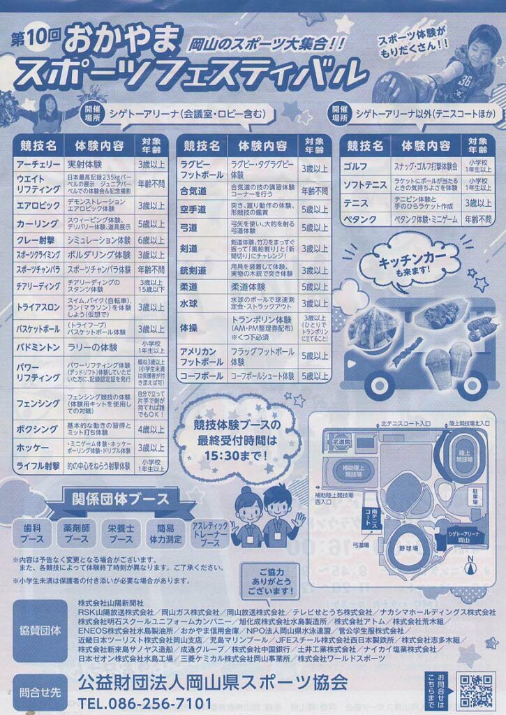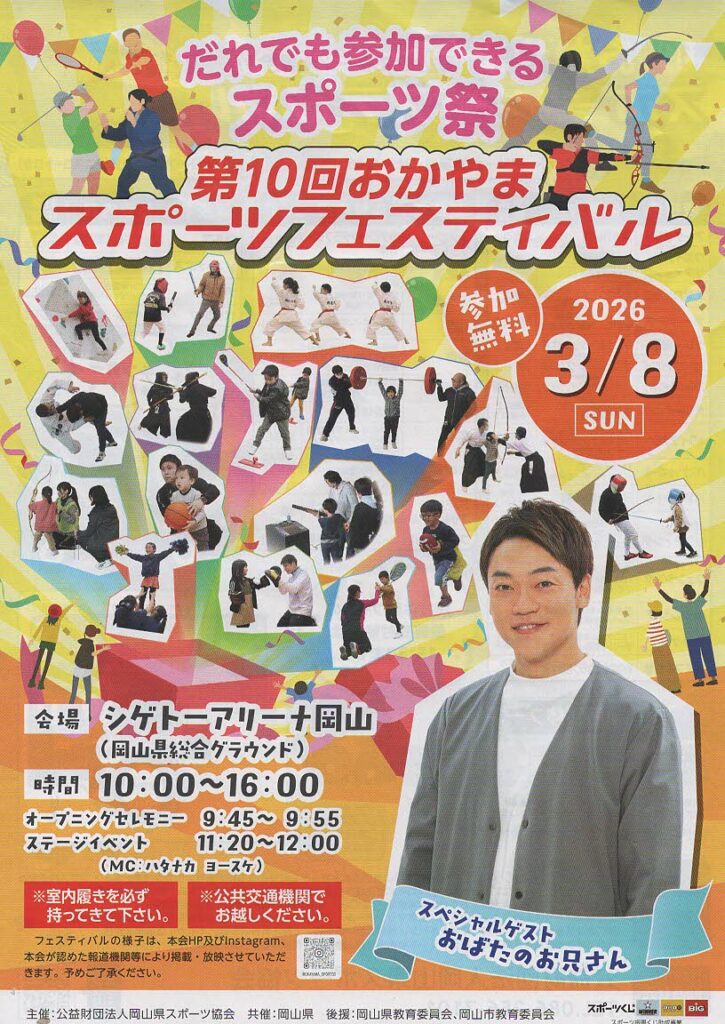 御津公民館で見つけたパンフの紹介です。3月8日(日)10時から「第10回おかやまスポーツフェスティバル」が岡山総合グラウンドのシゲトーアリーナ岡山で開催されます。スポーツ大好きの子ども達、参加願います。体育館シューズ持って来てね!
