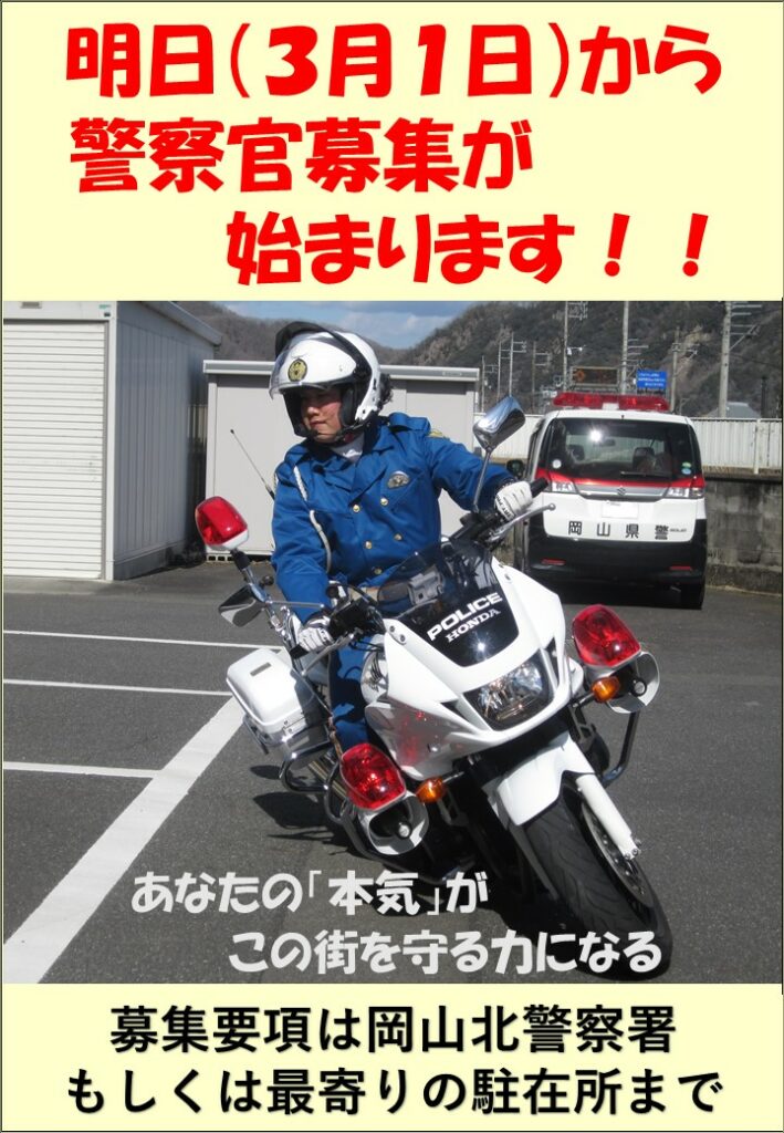 岡山北警察署LINE情報156 投稿日:2026年3月1日 岡山北警察署からLINEで届く情報を掲載しています(2/28) ★明日(3月1日)から警察官募集が始まります!! ツイート カテゴリー:電子町内会