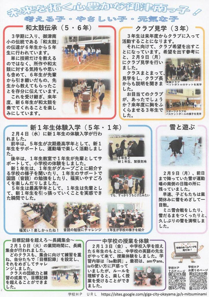 みなみっ子だより3月号-1を掲載いたします。心と心を伝え合った『6年生を送る会』、『いきいき班解散式』、『和太鼓伝承(5年、6年)』、『クラブ見学(3年)』、『新1年生体験入学(5年、1年)』、『雪と遊ぶ』、『目標記録を越えろ〜長縄集会〜』、『中学校の授業を体験』です。
