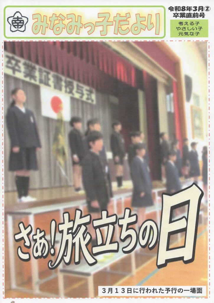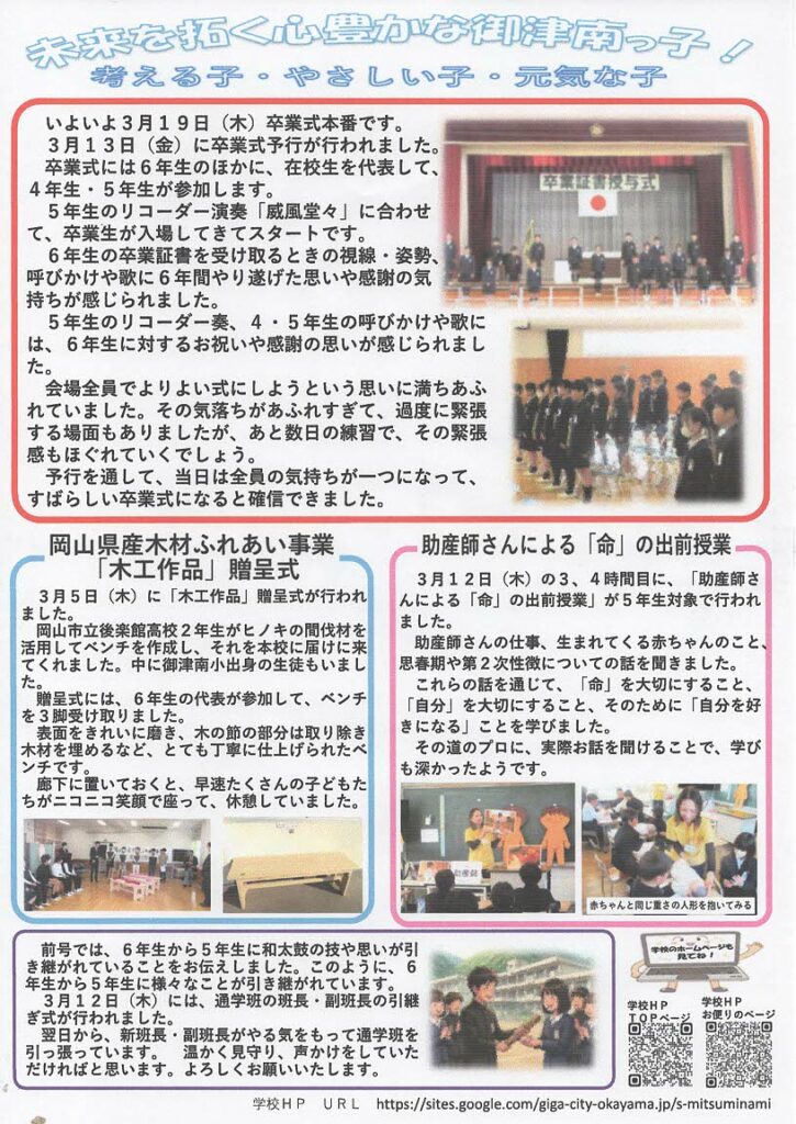 みなみっ子だより3月号-2を掲載いたします。『さあ!旅立ちの日』、『岡山県産木材ふれあい事業』、『助産婦さんによる「命」の出前授業』、『通学班の班長・副班長の引継ぎ式』です。