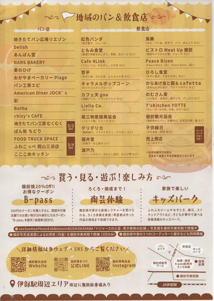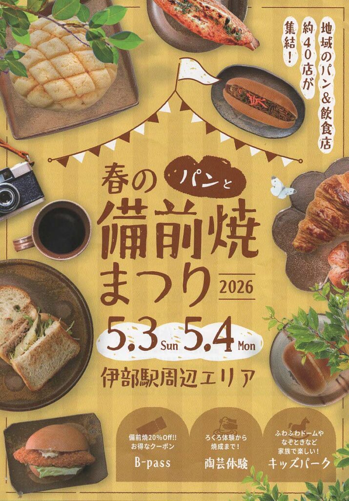 岡山刑務所で見つけたパンフの紹介です。5月3日、4日9時から伊部駅周辺エリアで地域のパン&飲食店、約40店が集結して「春のパンと備前焼まつり」が開催されます。ろくろ体験から焼成までの陶芸体験もあるので、備前焼きのお好きな方はどうぞ!