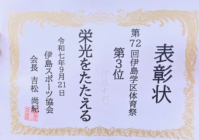 伊島学区体育祭2025 投稿日:2025年9月21日 9月21日、好天の元開催された学区体育祭で、今年中町は強豪を抑えて画期的な第3位、銅メダルを獲得しました。その勇姿をご覧ください。 カテゴリー:未分類
