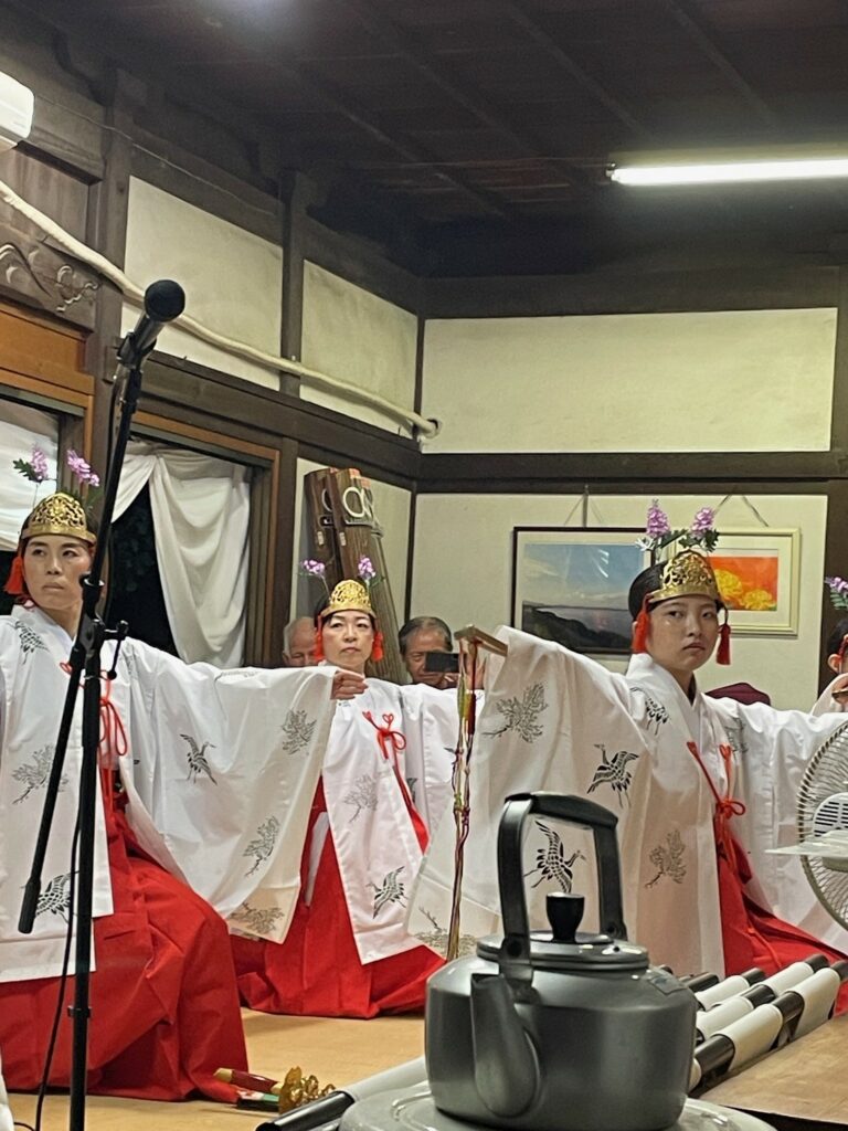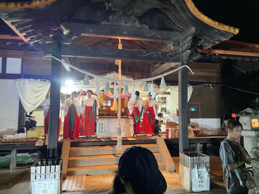 途中で雨が降り出し心配しましたが数十分で上がり続行です。町内会や個人の夜店も開かれ大勢の参拝者で賑わいました。巫女の舞・獅子舞(弘西地区の保存会)・岡山大學詩吟部や剣舞・琴の演奏など奉納行事などなど、