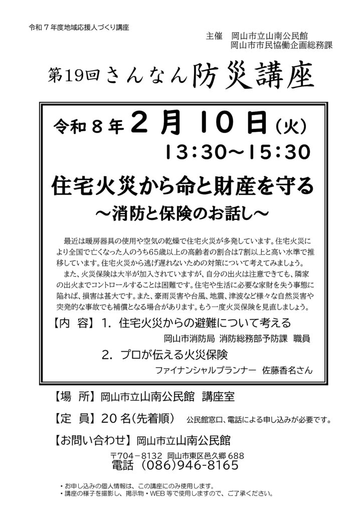 さんなん防災講座のご案内 投稿日:2026年1月7日 山南公民館より、さんなん防災講座の案内がありました。お問い合わせや申し込みは、山南公民館へ直接お願いします。 令和8年2月10日(火)13:30~15:30 住宅火災から命と財産を守る ~消防と保険のお話~ カテゴリー:イベント お知らせ