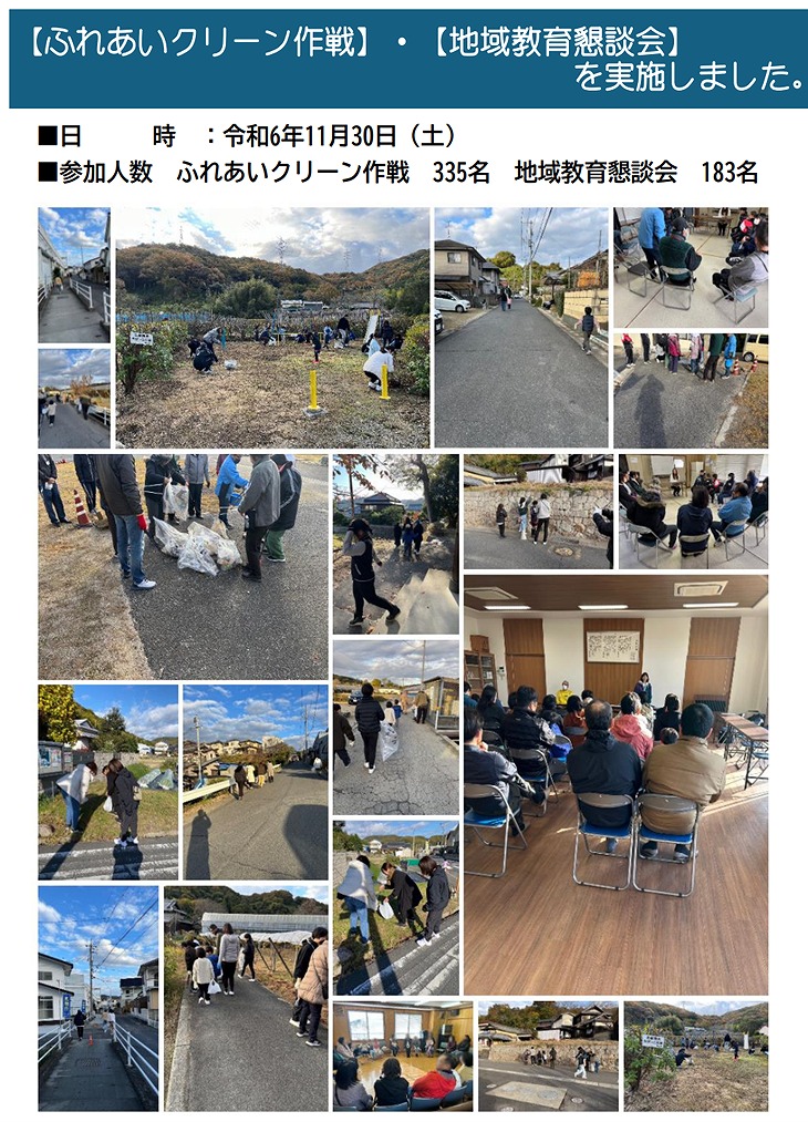 古都学区「ふれあいクリーン作戦」「地域教育懇談会」ご報告 投稿日:2024年12月19日 古都学区「ふれあいクリーン作戦」では、公会堂の掃除、通学路・公園のゴミ拾いや草取りなどを行いました こちらもどうぞ!👉ふれあいクリーン作戦 地域教育懇談会 各町内に分かれてコミュニティ・公会堂・集会所での地域教育懇談会を行いました カテゴリー:子育て支援 行事報告