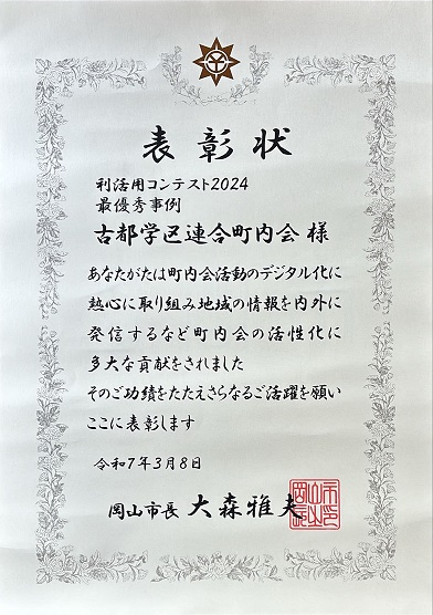 利活用コンテスト2024(令和7年3月8日(土)14:00~ピュアリティまきび)での、古都学区最優秀受賞の表彰状と記念品(Amazonギフト券)を受け取りました。