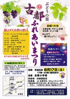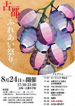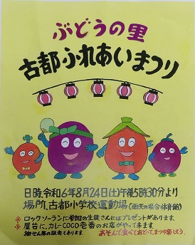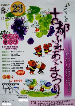 ぶどうの里古都ふれあいまつり 今までの案内チラㇱ 投稿日:2025年6月22日 ぶどうの里古都ふれあいまつり年表 令和6年(2024年) 令和6年(2024年) 令和5年(2023年) 令和5年(2023年) 平成30年(2018年) 令和元年(2019年) 平成25年(2013年) 平成26年(2014年) 平成23年(2011年) カテゴリー:ぶどうの里古都ふれあい祭り