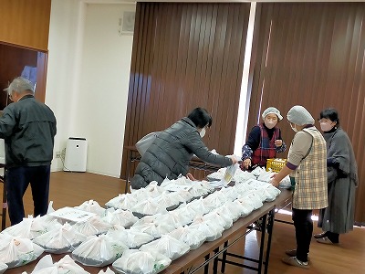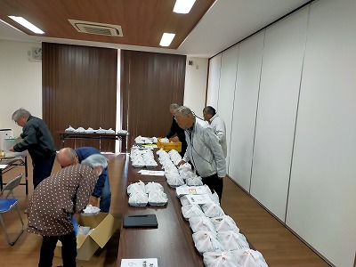 AM10:30頃お弁当が出来上がると、民生委員さん町内会長さんにバトンタッチ。各町内に分かれて長寿の方のご自宅にお弁当をお届けしました。