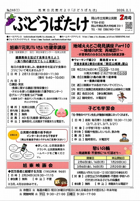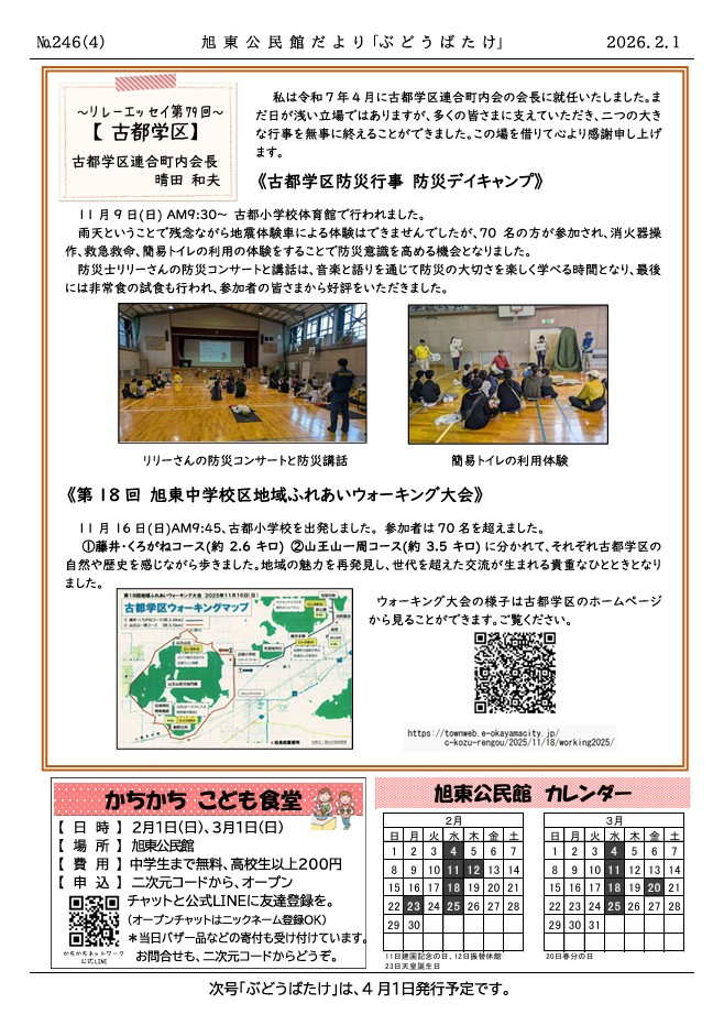 旭東公民館だより「ぶどうばたけ」2月号No.246 投稿日:2026年2月2日 4ページ目に古都学区の様子が紹介されています。ぜひご覧ください!クリック! クリックするとPDFで開きます クリック! カテゴリー:お知らせ