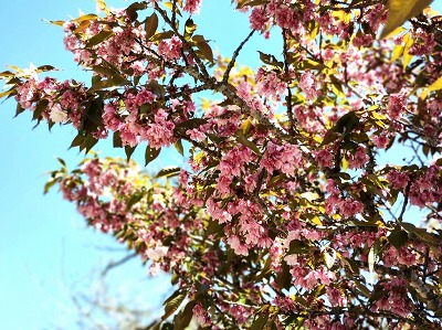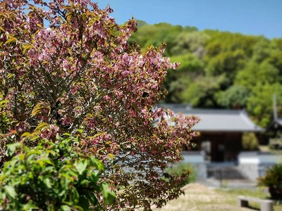 お寺での最後の桜が満開になりました。先日の雨で花がチラチラ・・・今日は青空の中、桜のピンク色がきれいです。