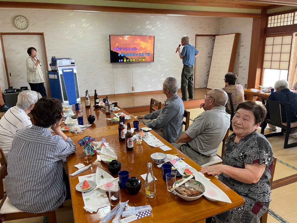 皆さんが、美味しい海の幸ランチで満腹になりました。店主からプレゼントされた活きた車エビが、元気で跳ね回って、あちこちで歓声が上がっていました。食事の後はカラオケやジャンケン大会で盛り上がりました。
