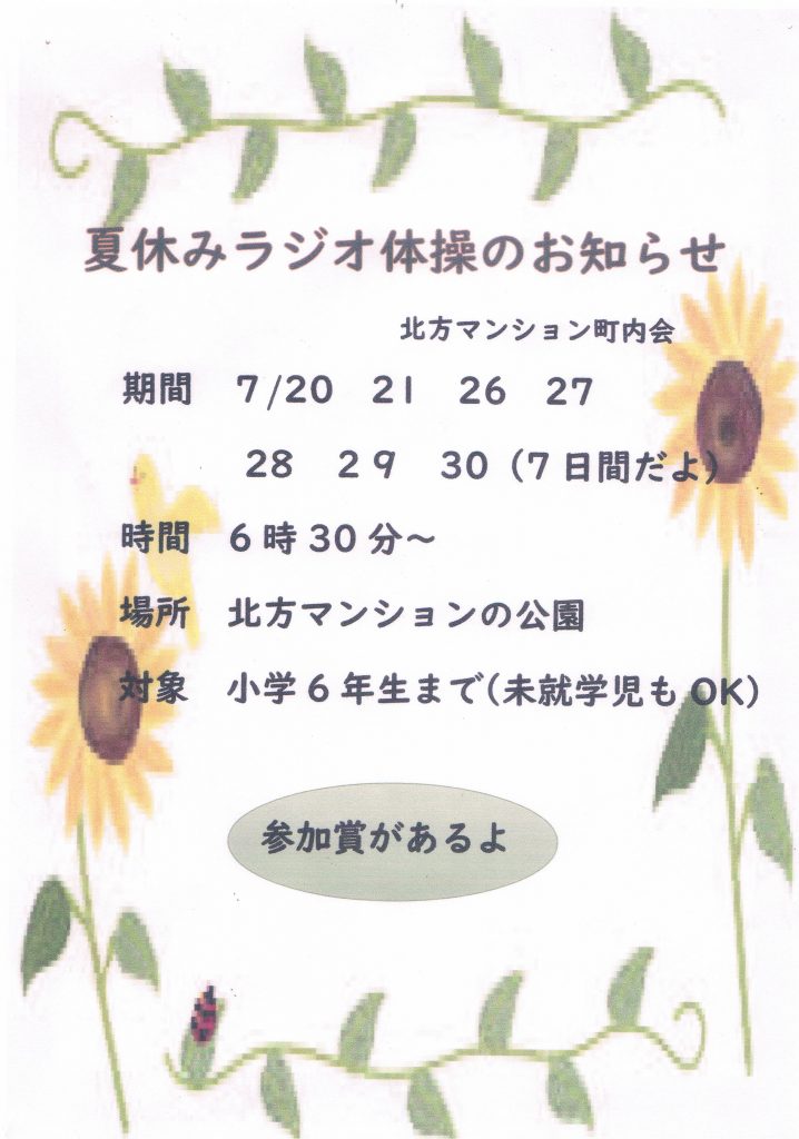 北方マンション町内会 ラジオ体操 投稿日:2021年7月7日 町内会役員会で開催を議論しました。去年はコロナの為に中止しましたが、子供たちにとって夏休みの大切な思い出として残るものであり、それが中止になってガッカリしていたという保護者の意見もあり今年は実施に踏み切りました。リスクと効果を計りにかけて実施と決めました。感染対策をして行います。 投稿者:赤澤 カテゴリー:単位町内会