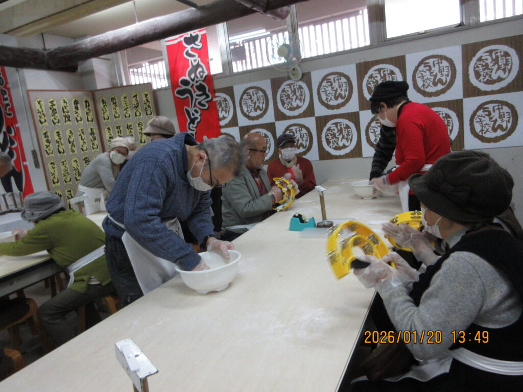 「田村神社」参拝と中野うどん学校で饂飩つくりを学びました、