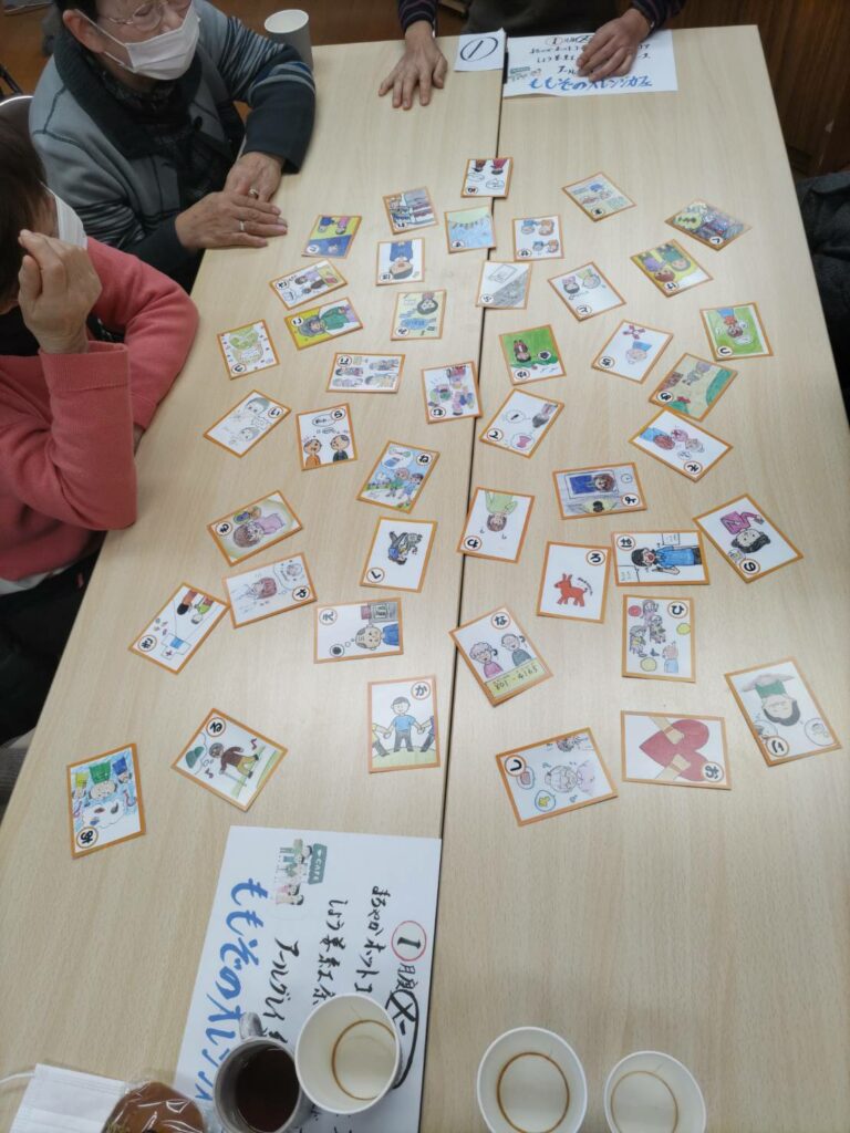 カフェに参加された35人の方々は、DVDアニメ「やっぱり笑顔のサブちゃんがいい」の視聴、キャラバンメイトさんから「私自身の体験談」や先月のアンケート報告、民生委員の活動紹介などのほか、パズル、お手玉、けん玉、将棋などを楽しみました。