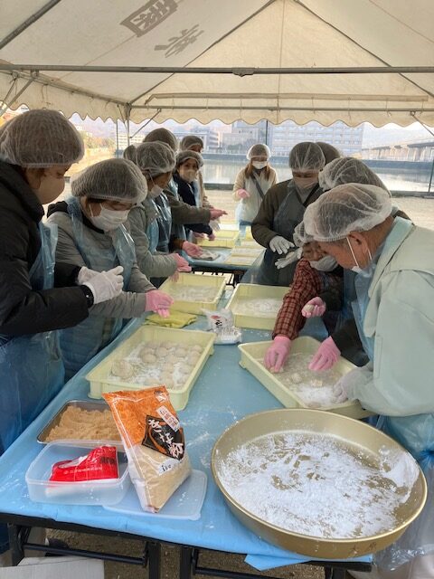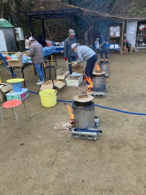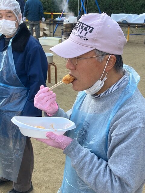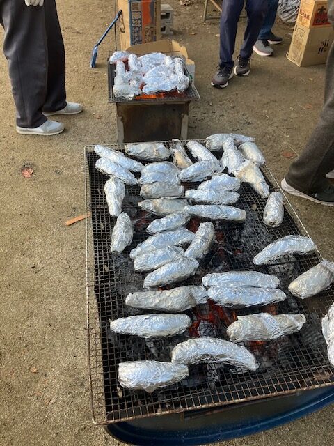天候にも恵まれ、多くの親子連れが参加し、婦人部やなかよし会の役員が14臼のお餅を手際よく丸め、ぜんざいやきな粉餅にし、また、焚火で暖を取りながら焼いた薩摩芋を皆で美味しくいただきました。