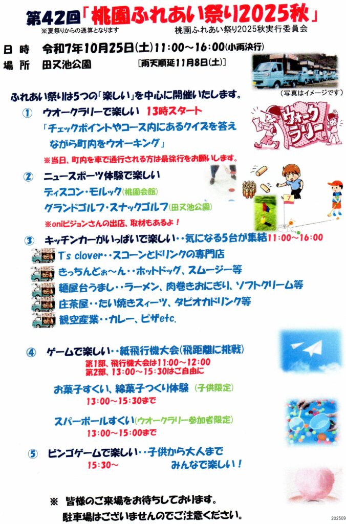 令和7年10月25日、天候が心配されましたが、「第42回桃園ふれあい祭り2025秋」が田又池公園で開催されました。