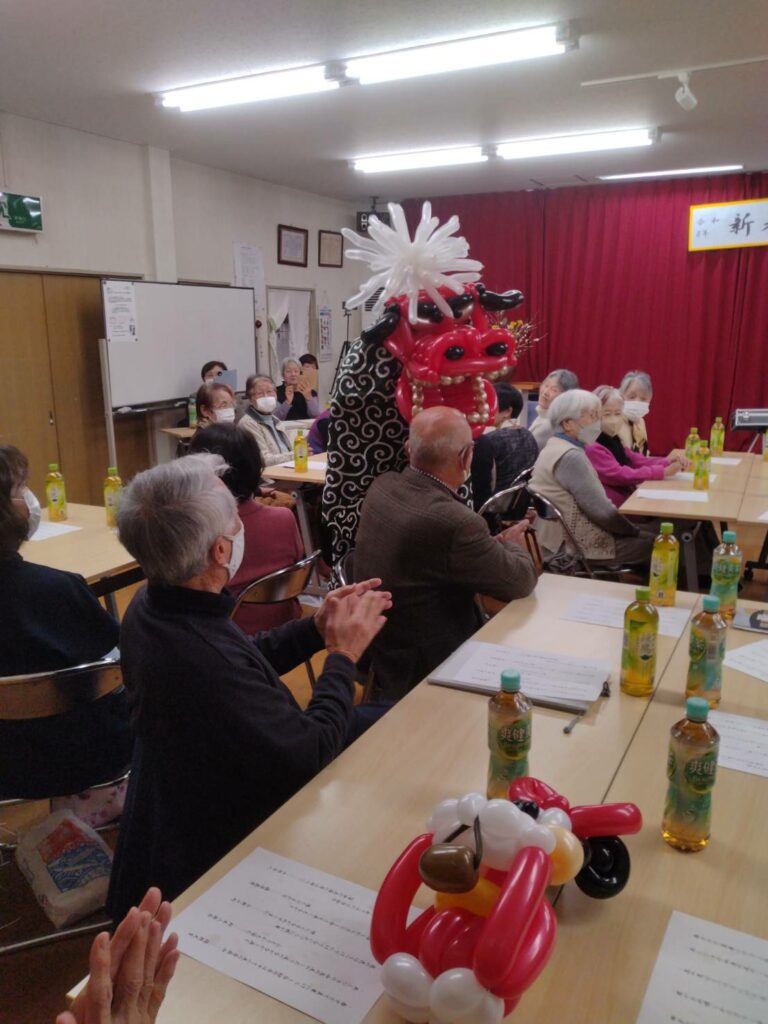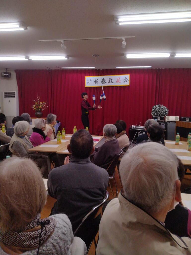 松本会長の年頭あいさつに続いて、パフォーマーりんさんのマジックやジャングリング、百人一首、リフレッシュ体操が行われたほか、3月2日から横井地区で試行運行さる「にこタク」(詳細は桃園町内会だより2026年2月号)について説明会があり、最後は参加者で祝膳を囲んで和やかに行われました。