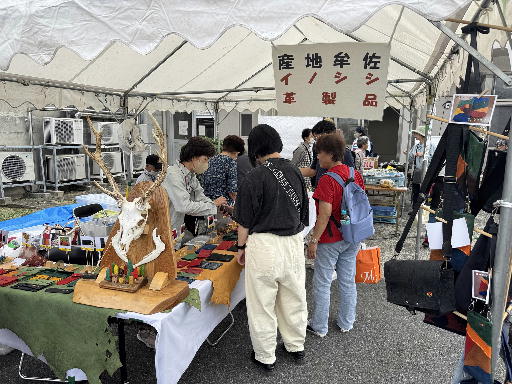 全国の刑務所作業作品の他、地元牟佐町内会からは、うどん、ぜんざい、イノシシ革製品、新鮮野菜の販売がありました。ステージイベントもあり、多くの来場者で楽しくにぎやかな二日間となりました。