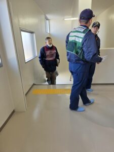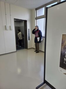 ロビーに集合して排水センターに避難訓練をしました。