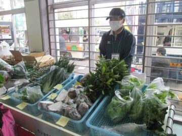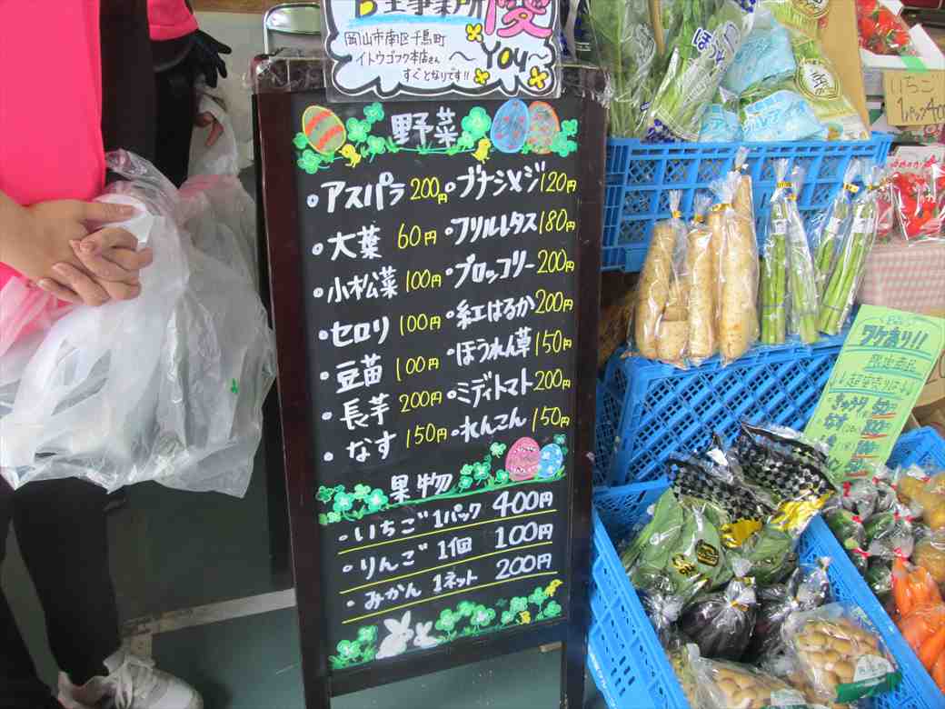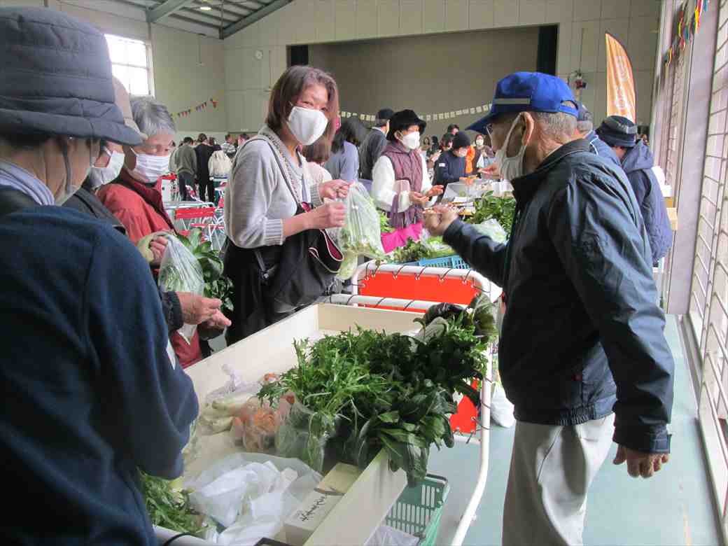 野菜は、水菜、壬生菜、ほうれん草、小松菜、ブロッコリー、里芋、などが出ています。みかんもあり人気です。とても長い行列ができています。