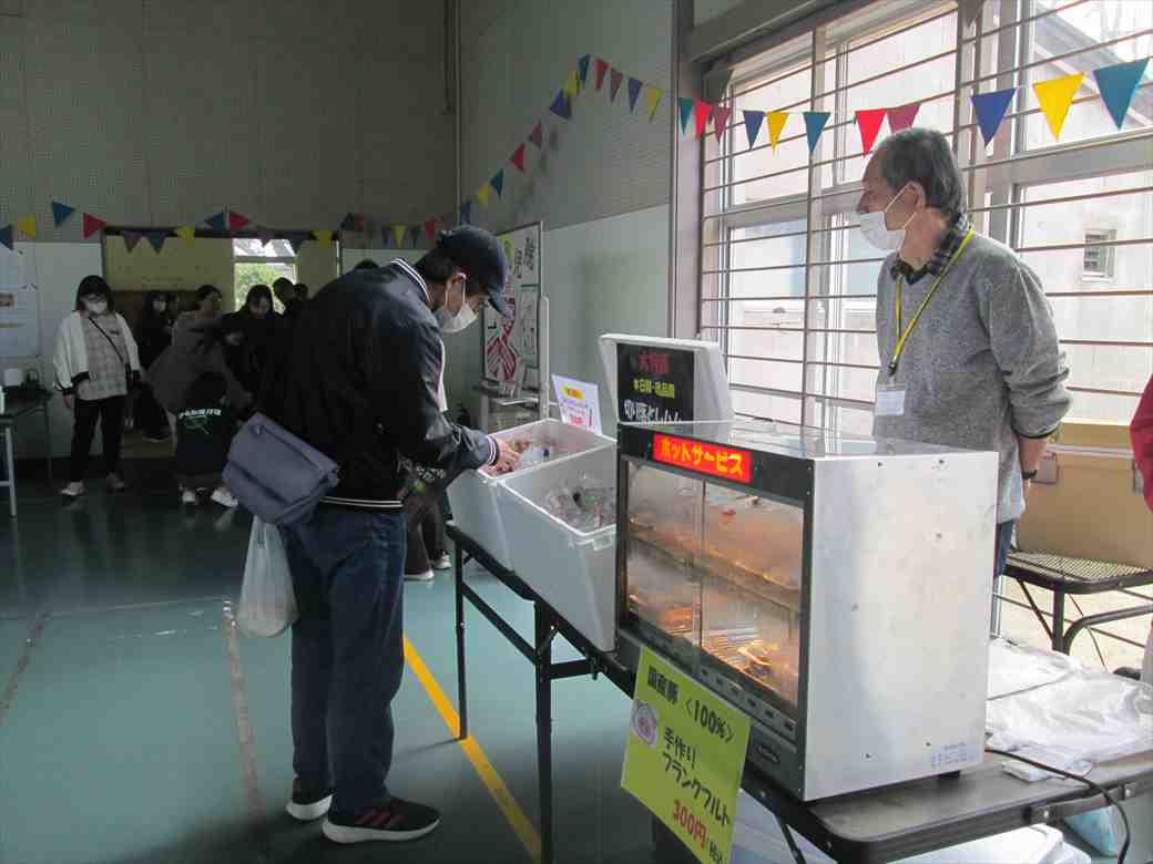 体育館の方では、ニコニコパンのパンがふかふかのでいっぱいです。今回もお豆腐屋さんはやはり人気で長い列です。和菓子屋、うどん屋もあり、美味しいものがいっぱいです。和菓子屋ではいちご大福が出ていました。