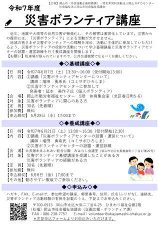 | お知らせ | 災害ボランティア講座チラシ | 市内全域 | 市民協働企画総務課 | 086-803-1061 |