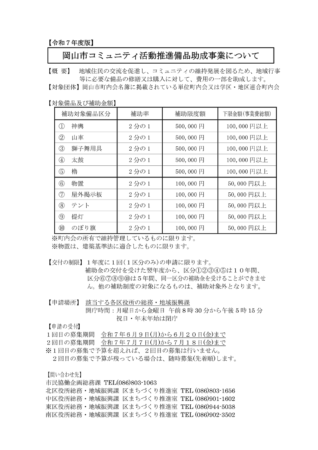 | お知らせ | 令和7年度コミュニティ活動推進備品のお知らせ | 市内全域 | 市民協働企画総務課 | 086-803-1063 |