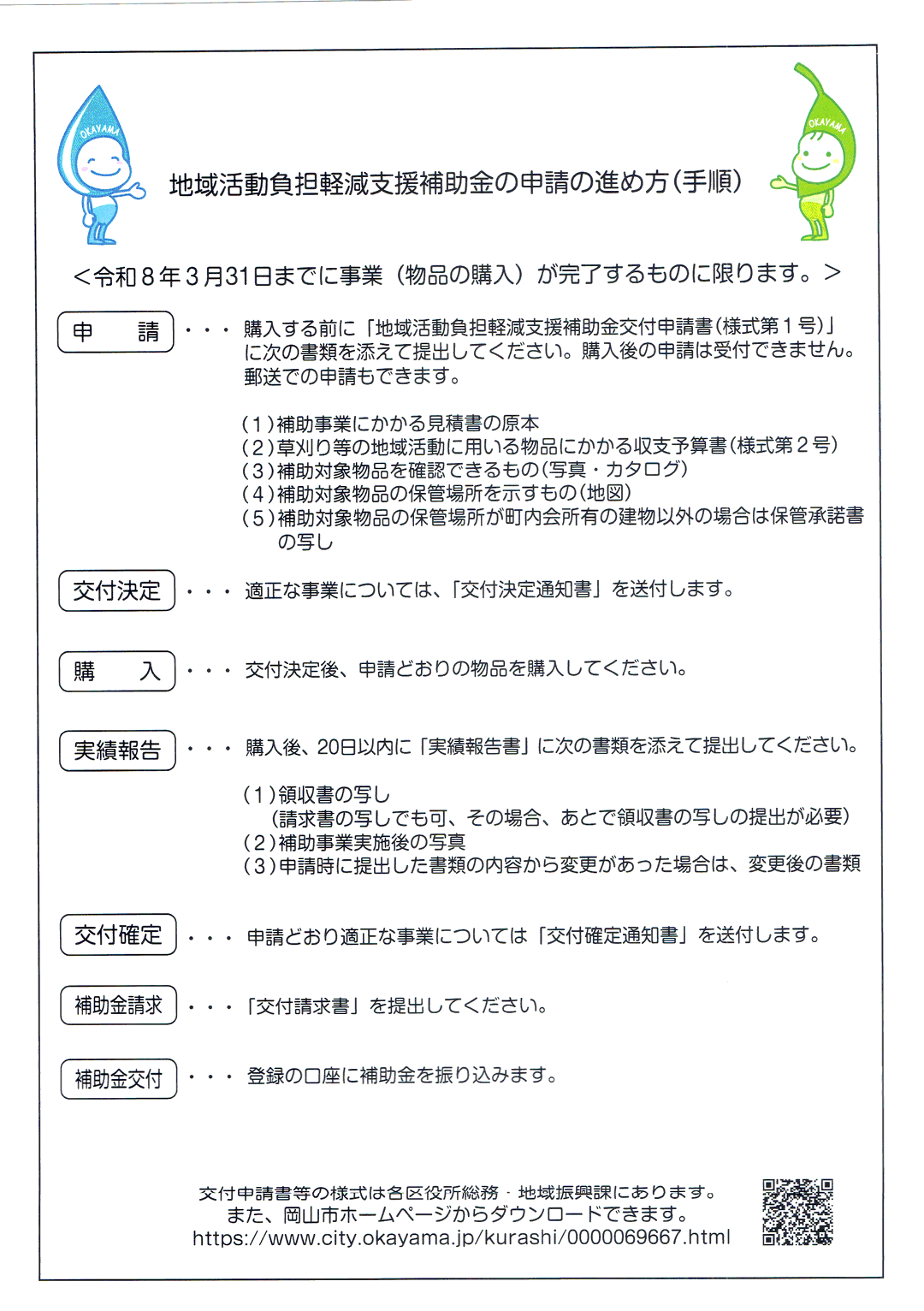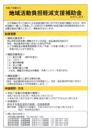| お知らせ | 地域活動負担軽減支援補助金のお知らせ | 市内全域 | 市民協働企画総務課 | 086-803-1063 |