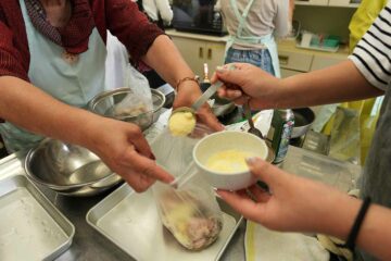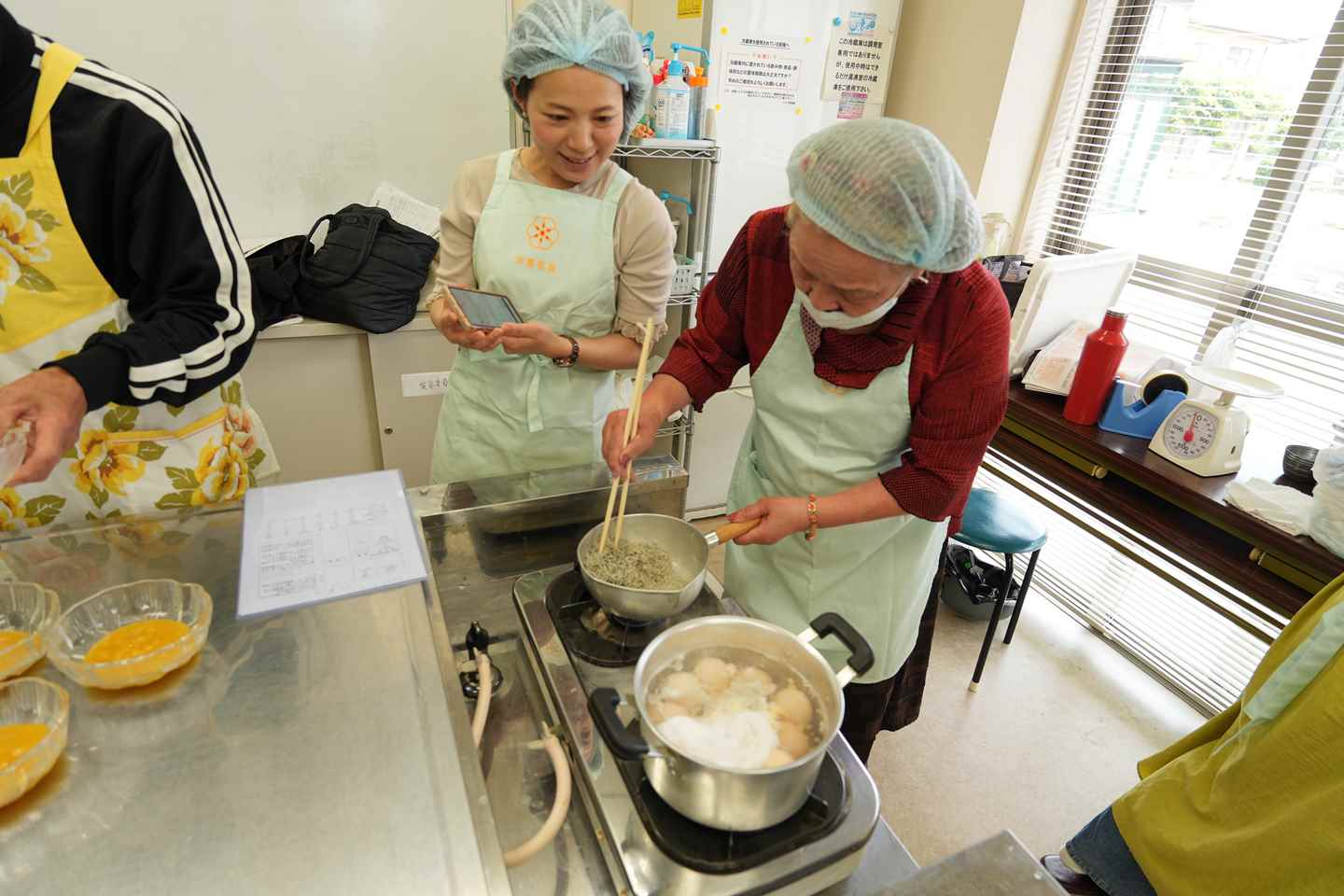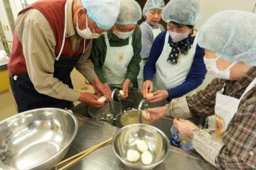 取材感想:料理ごとのテーブルで調理、皆様さんとても手際よく楽しくお喋りしていても決して手はとめない達人たちの技を今回も拝見できました。