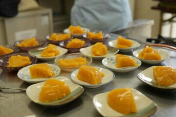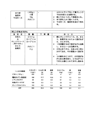 今日の献立は ①鶏肉のパン粉焼き ②具だくさんじゃこのみそ汁 ③塩こんぶの和風ポテトサラダ ④オレンジ水ようかん