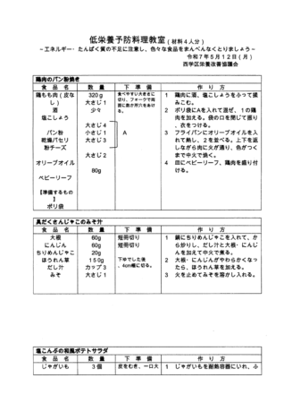 低栄養予防料理教室 2025年5月 ~コミュニティハウスで 西学区栄養改善協議会~t