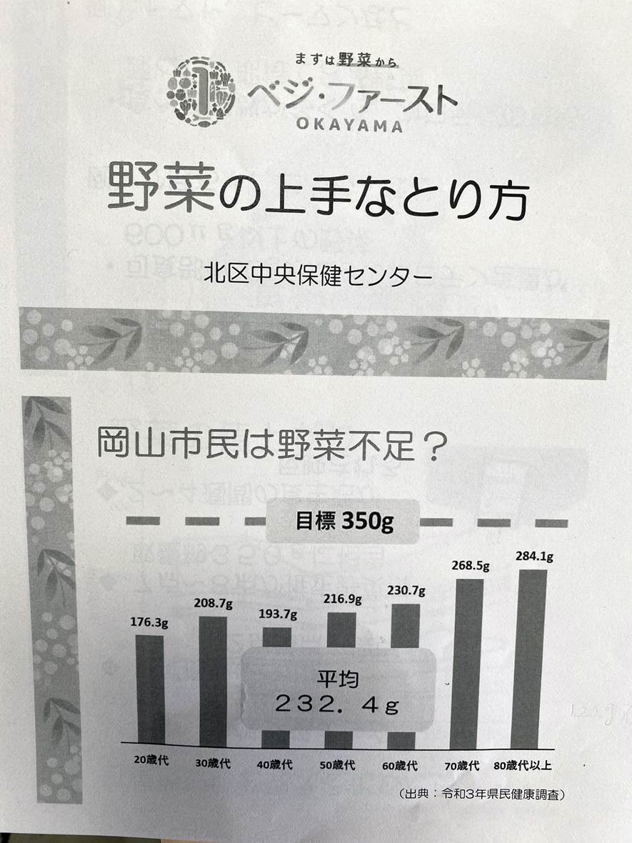 ① 岡山市民は 野菜不足⁈、、、 目標350gとすると 平均232.4gなので 120g少ない