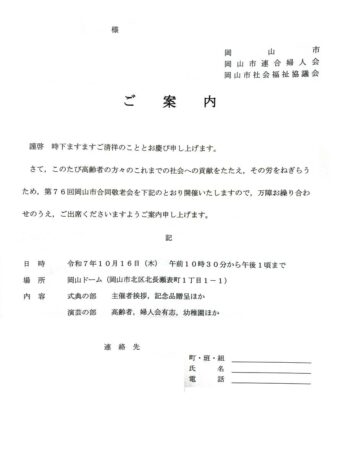 「今年は梅雨らしい雨の日が少なく あっという間に梅雨明け宣言。それ以降は 真夏日のような猛暑が続いています。、、、気温が高い日、時間は 涼しい所で過ごして下さい。たとえ 部屋の中でも 水分をしっかり摂ることを忘れず 熱中症には気をつけてください。特に これから 暑い時期に 敬老会の件で町内会を回って頂くことにもなりますので どうぞ 体調には 気をつけて活動をして下さい。お世話になり有難う御座います。」