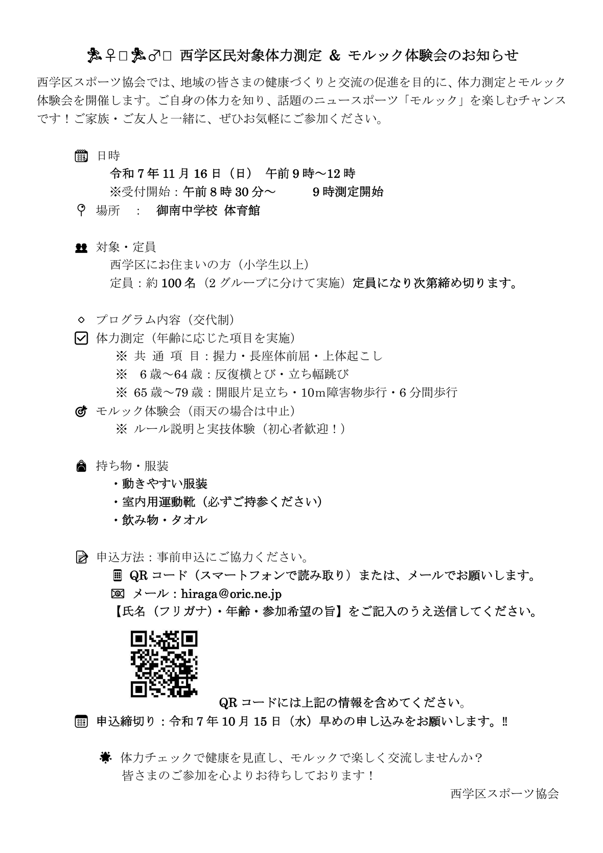 西学区体力測定&モルック体験会の開催案内 10/15申込締切、11/16実施~西学区スポーツ協会~