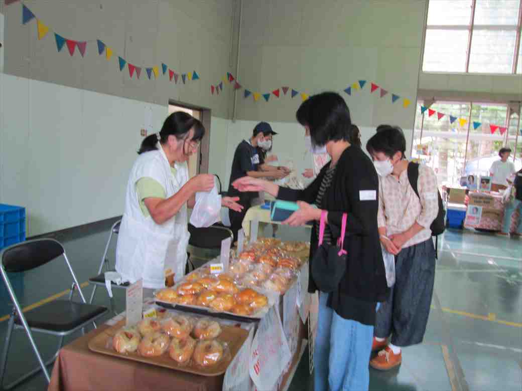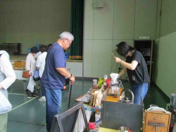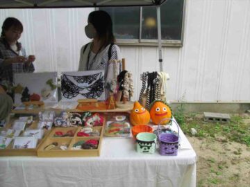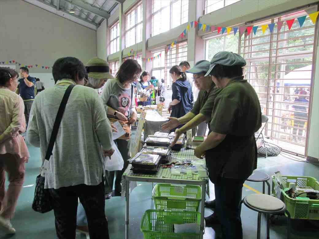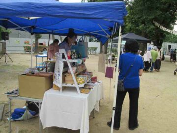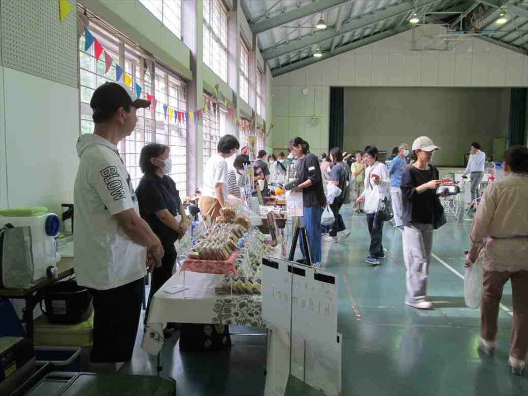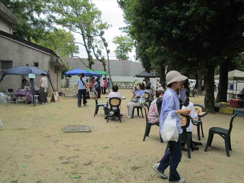 だいぶ涼しくなりました。雨がふりそうな天気でしたが、なんとか持ってくれました。杜と体育館内での両方での開催です。杜の木陰は涼しさを感じますが、体育館の中の方は少し蒸し暑かったです。お客さも大勢こられております。