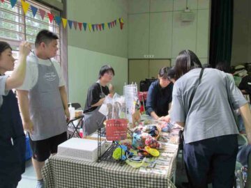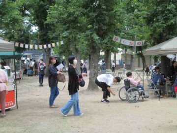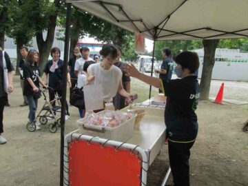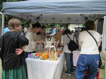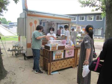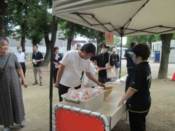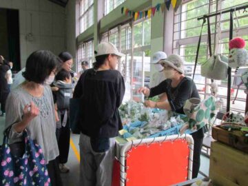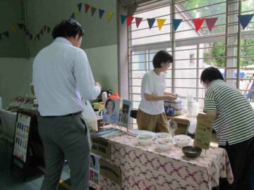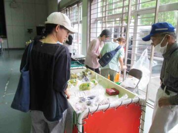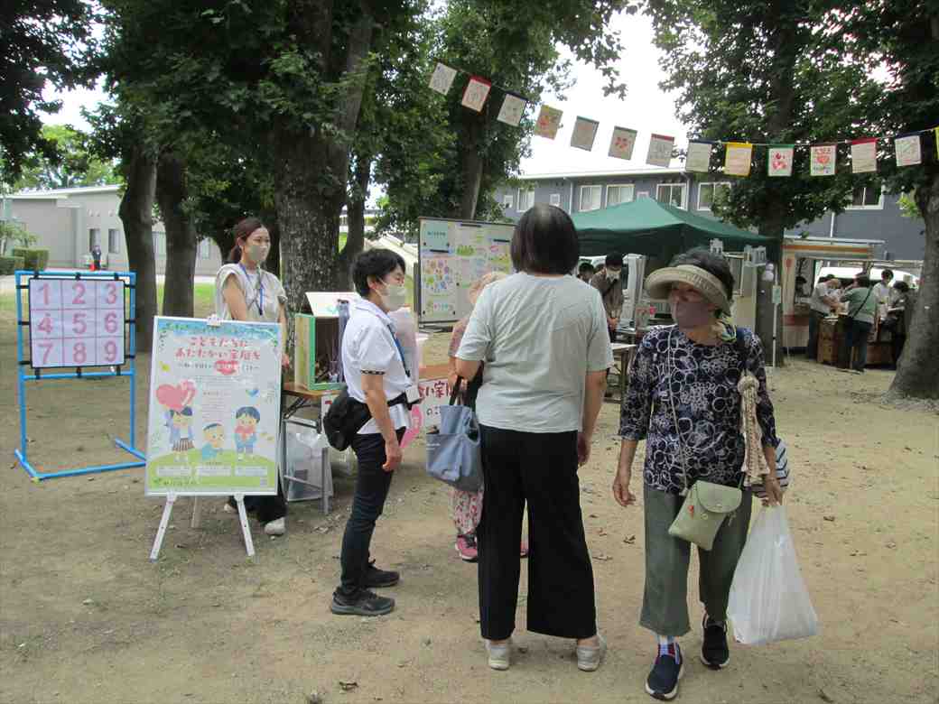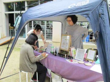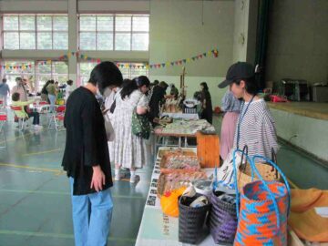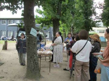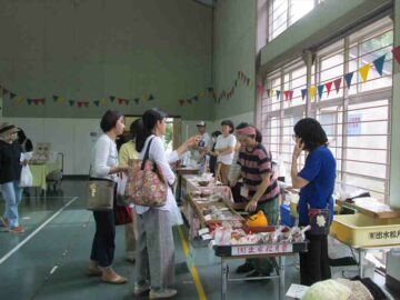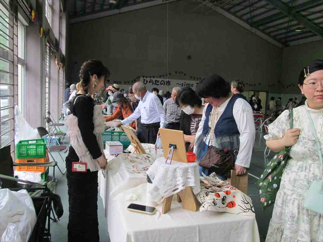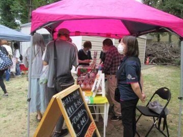 だいぶ涼しくなりました。雨がふりそうな天気でしたが、なんとか持ってくれました。杜と体育館内での両方での開催です。杜の木陰は涼しさを感じますが、体育館の中の方は少し蒸し暑かったです。お客さも大勢こられております。