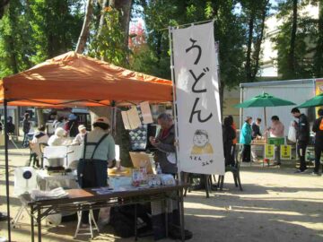 和菓子屋さんもおはぎ、赤飯など、美味しそうなものがいっぱいです。うどん屋さんも来ていました。寒くなりましたので温かいものが人気です。