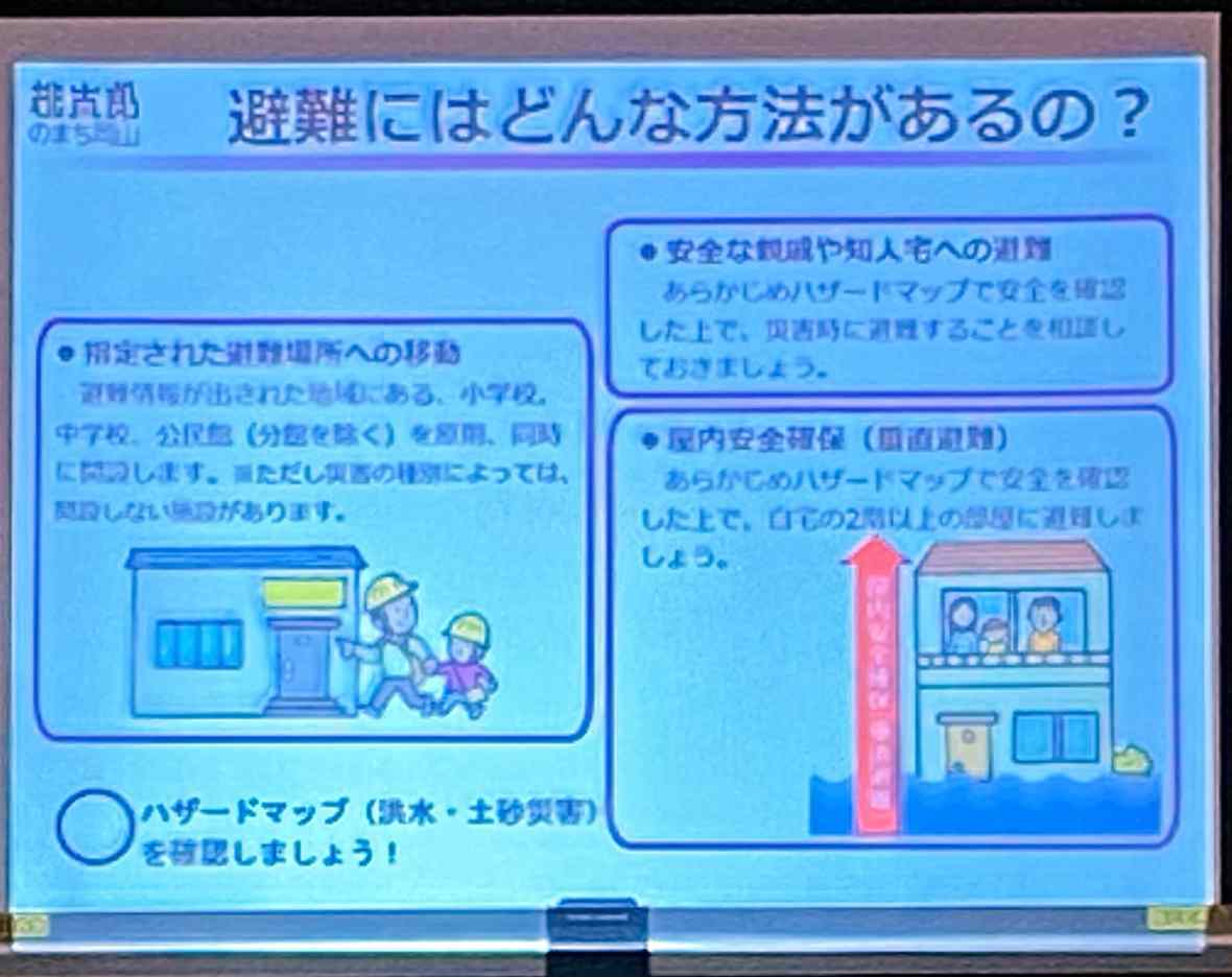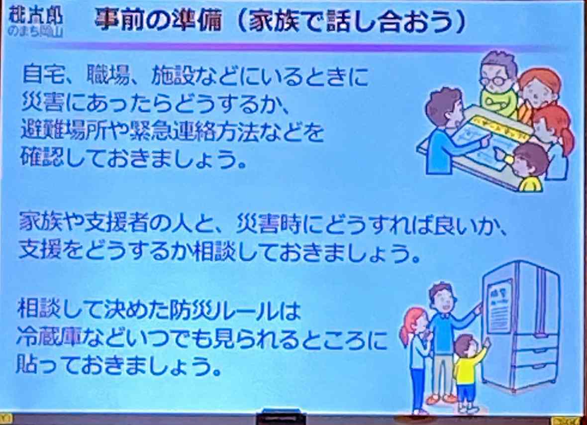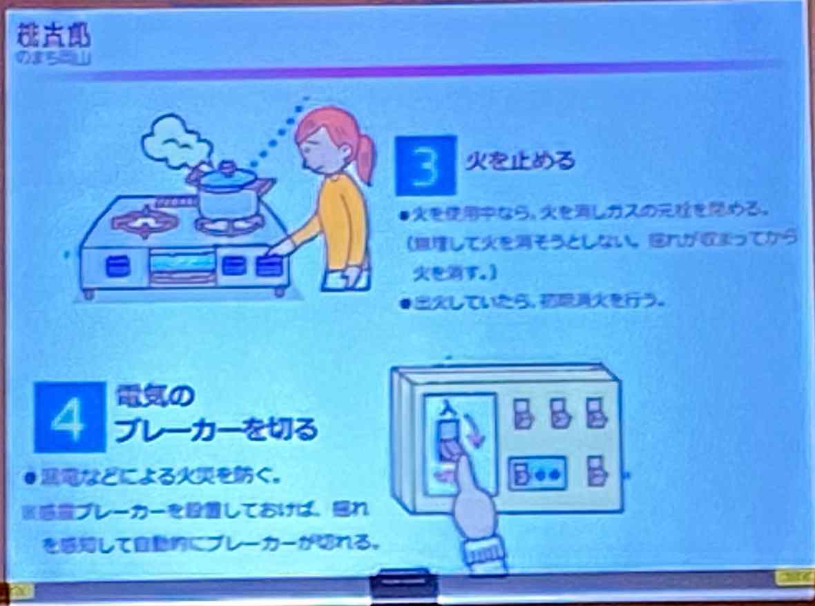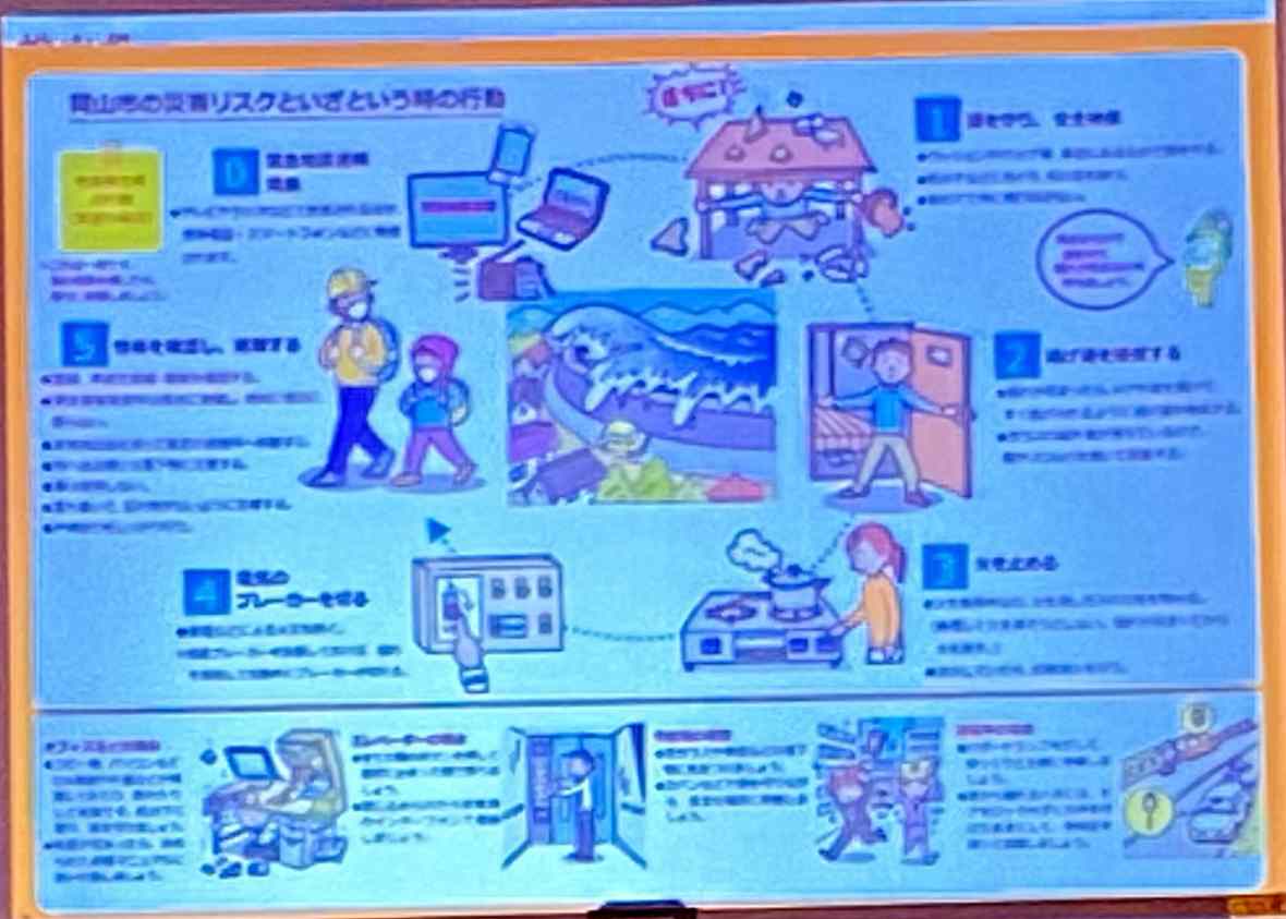 岡山市全体の家庭で災害への備えをしていると7割の災害が減ると一番に話され、災害への備えの大切を感じました。